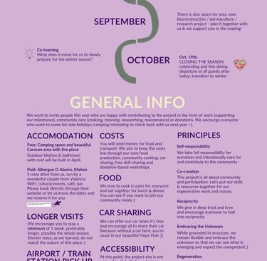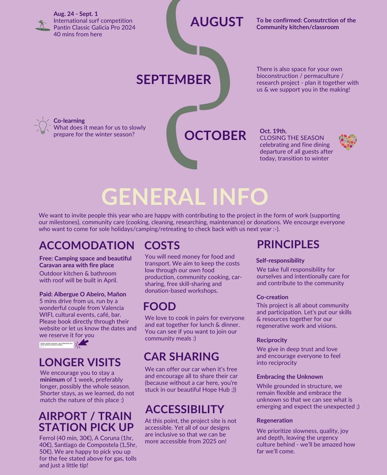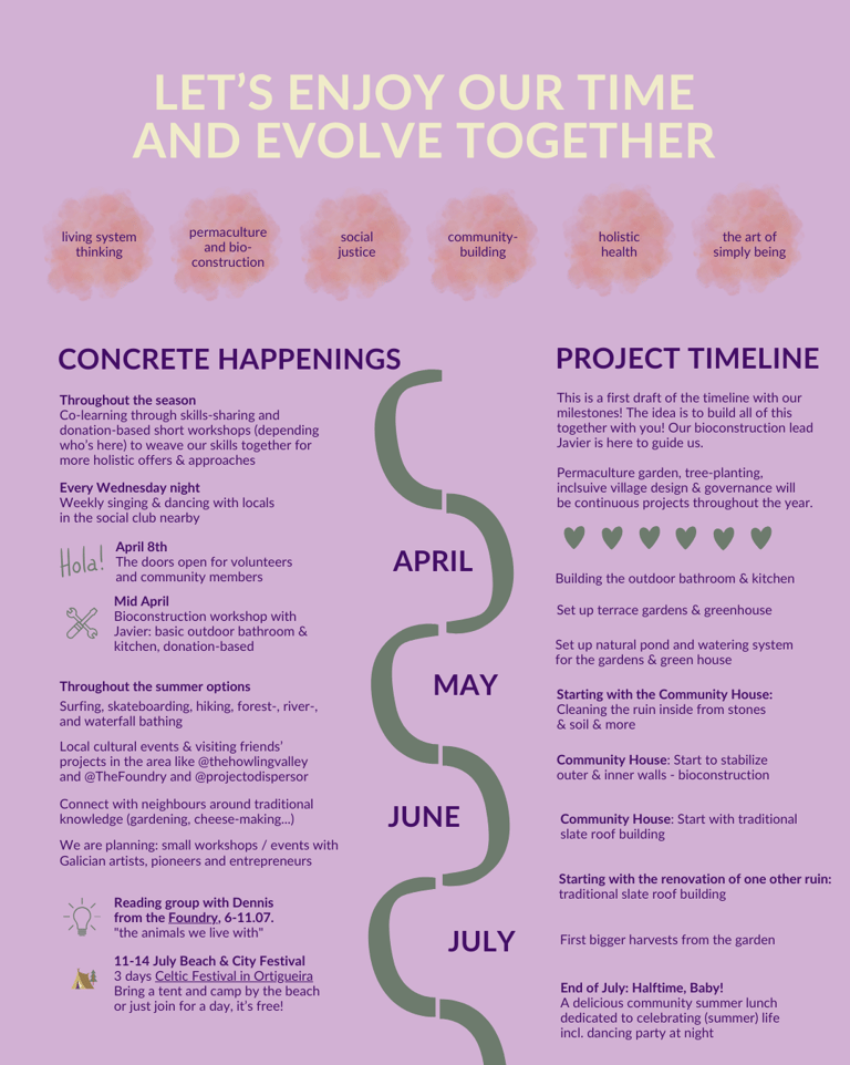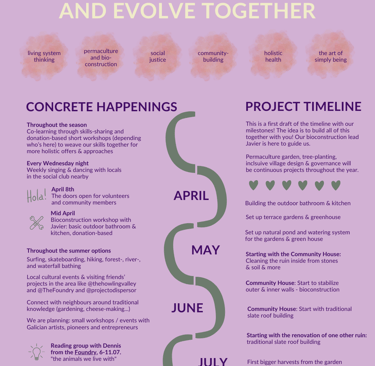 We put together some info about the planned timeline, 2024 happenings and events and principles to stay with us this year. Our intention is to flow through the season, connect and co-create with core regenerative partners and people who are aligned with our vision while getting some bioconstruction and permaculture projects done for the project 🧡!