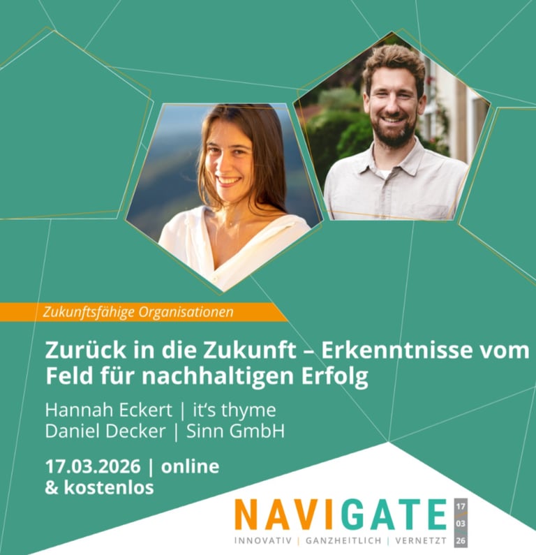 Wirtschaftlicher Erfolg entsteht dort, wo Menschen sich verbunden fühlen und Verantwortung gemeinsam tragen. In ihrem Vortrag teilen Hannah Eckert (It’s Thyme) und Daniel Decker (S!NN GmbH) Einblicke aus der Praxis, wie Prinzipien regenerativen Wirtschaftens nachhaltige Transformation ermöglichen – jenseits von Greenwashing, Effizienzdenken und isolierten Nachhaltigkeitsmaßnahmen.